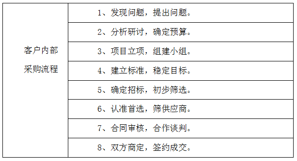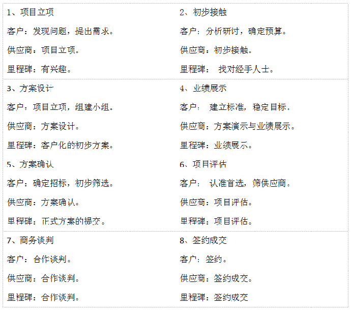 | 企業業務管控需要一套完善的管理系統,我們這里特別設定企業業務管控系統。它不僅僅是一種管理理念,同時也是一個管理體系、一個操作性很強的管理系統。 業務管控系統非常提倡過程管理,而且控制過程比控制結果更重要。在銷售中,一個銷售項目受到太多來自內部和外部因素的影響,其結果的成敗與否是難以預測和控制的。 一、業務管控系統的特點 主要是讓原來只掌握在銷售人員手中的有關銷售過程的信息向銷售團隊、銷售經理和企業公開,使得: l 銷售人員的信息更加公開化,便于掌控客戶的進展; l 讓項目的銷售過程更加明確化,標準化,系統化; l 便于項目內部的角色分工,使團隊合作進一步加強; l 更好地做好銷售管理與銷售預測的工作; l 企業積累應有的銷售知識和客戶資源。 二、企業業務管控系統的模型圖 如圖6-1所示。 ![]() 圖6-1 企業業務管控系統的模型圖 基礎組成要素:了解客戶內部采購流程 客戶內部采購流程是從客戶的角度對整個采購過程一般必須經過的步驟進行劃分和描述。它通過跟蹤和記錄客戶采購目前的狀態以及客戶、競爭對手的回應,依據對內部采購流程的劃分,分析并確定目前客戶采購所處的階段。讓我們更清晰的去了解,如何去對這八大流程階段進行分析,該從哪幾個方面進行著手??蛻魞炔坎少徚鞒贪藗€階段如表6-1所示。 表6-1 八個階段表 ![]() 1、 發現問題,提出問題; 一般公司都是有現成的供應商,我們的機會點就在尋找目前客戶與現有供應商合作中的不滿意或者問題,往往問題越大,我們的機會點就比較有優勢。所以,在采購方的需求醞釀的階段,銷售方在這個階段介入明顯是最好的時機,畢竟“先入為主”,銷售方可以在這個階段影響到采購方的后來的“采購標準”。 2、分析研討,確定預算; 了解目前項目的預算,確立項目立項的可能性,萬一項目的預算少了,一般都要通過老板來進一步申請,這時,往往與老板見面的可能性較大,有時項目的經辦人無法說服他自己的老板,有可能請你協同說服。 3、項目立項,建立小組; 緊接著,在客戶項目立項階段,銷售顧問應當提供準確信息,培養內部的spy立項,準備應標。因此需要對內部采購流程相當了解,如此才能建立項目采購的優勢。 4、建立標準,穩定目標; 當客戶的采購部門開始收集信息和標書時,銷售顧問應當在內部確認招標范圍,主動了解技術表述的內容,參與制定采購標準,目的是為了建立客戶關系,同時了解競爭對手以及客戶內部的關系。 5、確定招標,初步篩選; 經辦人通常是客戶內部的采購經理類的角色,他需要發布信息,收集信息,同時,初步篩選合格的供應商,一般是從十家供應商剩下三家等,為確定首選供應商做鋪墊。 6、認準首選,篩供應商; 通過技術標與商務標的因素而確立篩選的標準,例如:價格、質量、品質、品牌、行業標準、職業化、關系等因素來選擇首選的供應商。 7、合同審核,合作談判; 最為采購方來說,確定供應商后,要在談判中盡量壓低成本,并為企業爭取有利的付款方式降低風險。該項目后續實施如何很大程度上取決于合同條款上的具體規定,所以該過程是非常關鍵的,客戶可能專門組織談判小組,與首選供應商來談具體的條款。 8、雙方商定,簽約成交。 商務具體條款雙方商定后,雙方法人簽署合同。開始進入具體的合作及售后服務階段,在該階段之前,可以說銷售方是很成功的,否則,對方也不會選擇和你合作。有人錯認為銷售活動到此結束了,其實還沒有,這只是個開始,如何將該客戶綁定為企業的忠實客戶,這就需要銷售方在實施及售后客戶關系維系方面下工夫了。 該管控系統的起點是客戶內部采購流程。產品、服務的供應方了解客戶內部采購流程的目的是為了提高銷售的成功率。每個客戶都有自己的一套內部采購流程。供應方想要實現銷售,必須按照客戶的規則行事,根據客戶的內部采購流程來一步一步推進銷售過程,如果無法隨著客戶內部采購流程不斷前進,就代表著供應方的銷售失敗了。因此,在銷售中,供應方在規范化企業內部的銷售流程之前,應該首先關注客戶內部的采購流程??蛻魞炔坎少徚鞒倘绻磺逦?,就不知道應該如何根據客戶的采購流程做出及時準確的響應。 客戶內部采購流程是該管理系統的基礎組成要素。銷售最大的特點就是“以客戶為中心”,在實際銷售中的做法就是:尊重客戶的興趣、需求和規則。因此,業務管控系統將“尊重客戶的規則”放在了第一位,銷售和管理都是圍繞著客戶內部采購流程展開的。銷售流程管理系統從兩個方面向我們介紹客戶內部采購流程。首先是從理論推廣的角度,向我們介紹了客戶的內部采購流程的一般形式和步驟。其次是從實際應用的角度,向我們介紹客戶內部采購流程的操作和應用,譬如如何根據客戶內部采購流程來收集和使用有關客戶、競爭對手的信息。 主要組成要素:業務推進流程 我們知道,處于內部采購流程不同階段的客戶位于銷售漏斗的不同狀態。隨著內部采購流程的推進,客戶所在的狀態也在向銷售漏斗底部的最佳狀態推進,這也意味著銷售的成功幾率的逐步上升。 如何保證客戶的內部采購流程順利向前推進呢?也就是說,作為銷售一方,我方應該做出哪些努力呢?我們為了保證客戶內部采購流程順利向前推進而做出的努力所形成的軌跡,就是我們的業務推進流程。 對應于